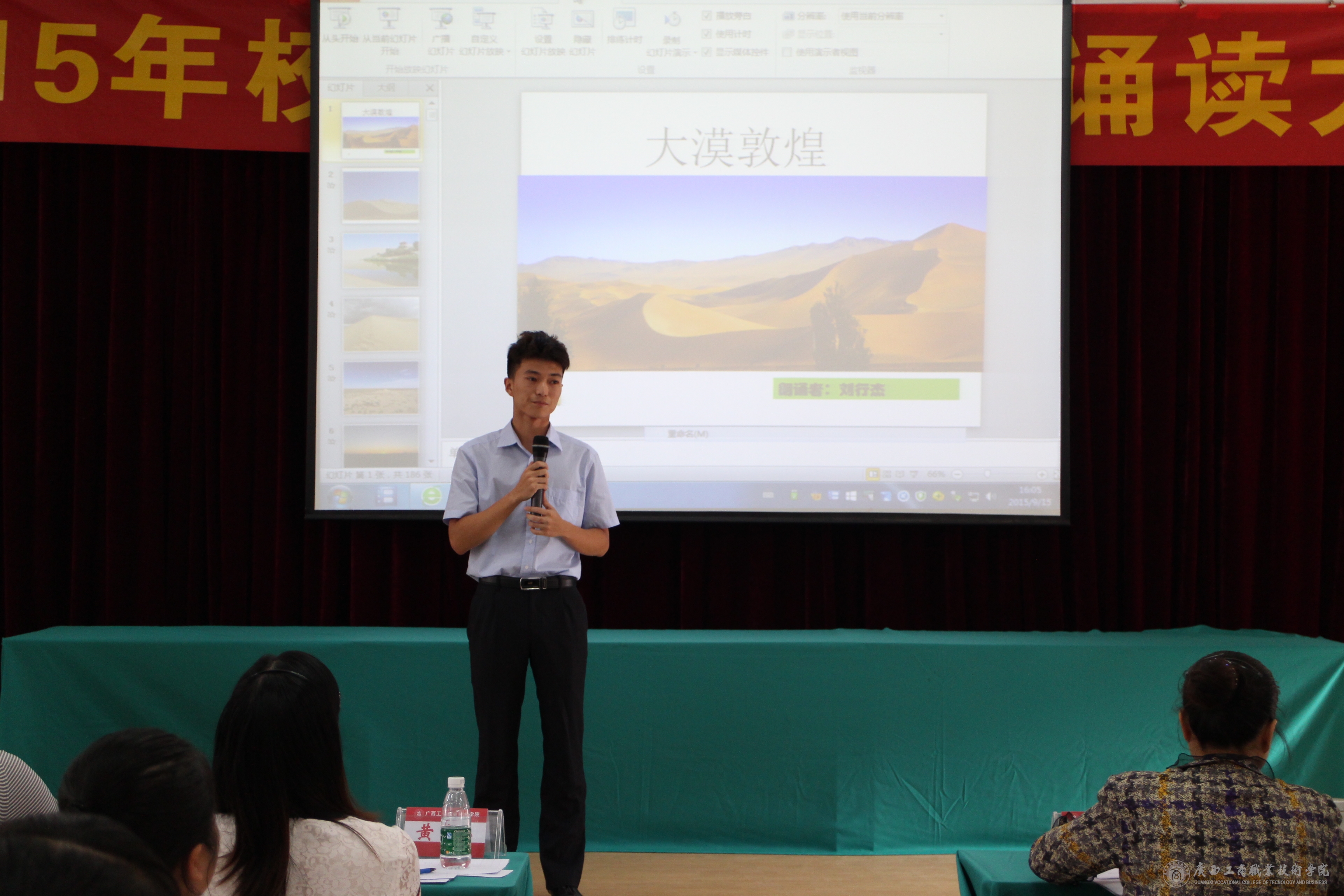 在今年的“中華經典詩詞誦讀”學院決賽前夕,我院各系部積極開展預賽,進行選拔。決賽當天,雷光教授、甘敏軍副教授、黃英副教授、周紅湘副教授、梁曉霞老師、劉佳家老師、賈雨瀟老師擔任評委。會電1431班、酒店1502班學生,以及相關社團的學生代表參加了活動。