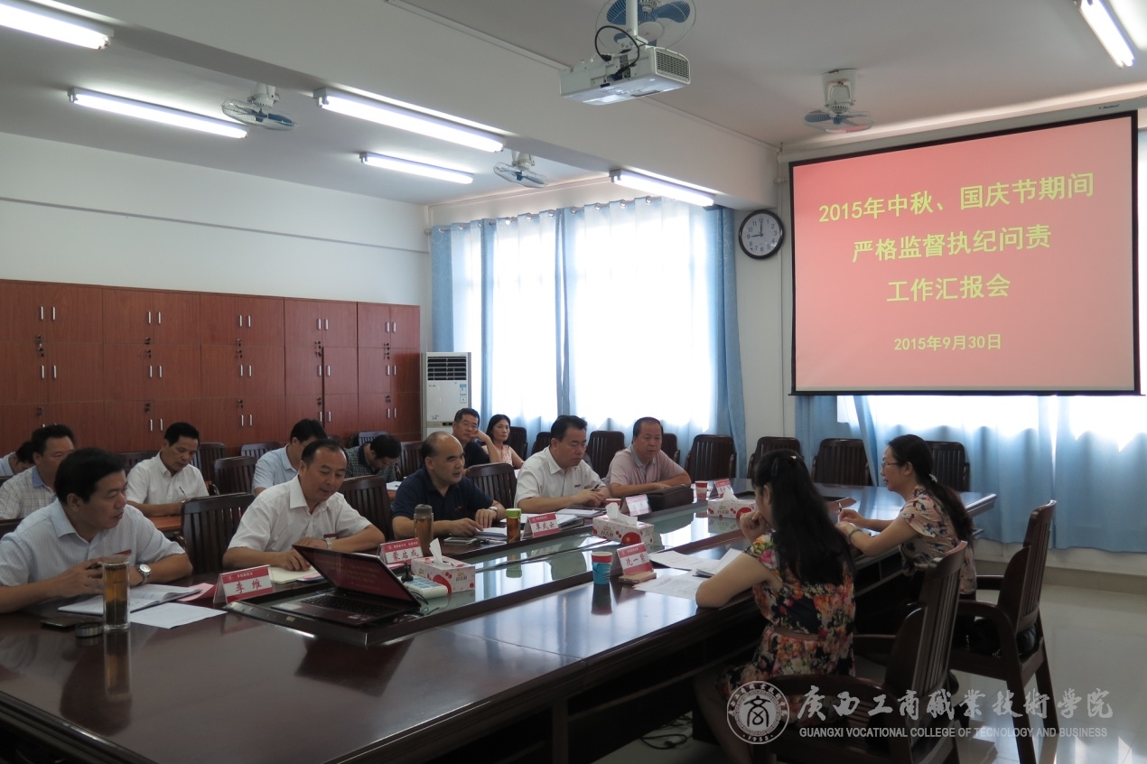 9月30日上午,關(guān)于2015年中秋、國(guó)慶節(jié)期間嚴(yán)格監(jiān)督執(zhí)紀(jì)問(wèn)責(zé)工作匯報(bào)會(huì)在我院校本部教學(xué)樓2109會(huì)議室召開(kāi),自治區(qū)糧食局黨組成員、紀(jì)檢組組長(zhǎng)歐澤馨和局機(jī)關(guān)黨委副調(diào)研員冼一紫參加工作匯報(bào)會(huì),聽(tīng)取2015年中秋、國(guó)慶節(jié)期間嚴(yán)格監(jiān)督執(zhí)紀(jì)問(wèn)責(zé)工作的匯報(bào),學(xué)院領(lǐng)導(dǎo)覃武云、陳杰、蒙啟成、李仕欽、李維,各黨政部門(mén)負(fù)責(zé)人、監(jiān)察審計(jì)室全體人員參加了會(huì)議。