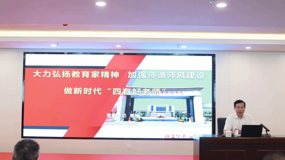 7月8日下午,學校黨委書記李維為新進教師開展了《師德師風》專題授課,他從學習習近平總書記關于大力弘揚教育家精神的重要指示、《新時代高校教師職業行為十項準則》解讀、寄語廣商院青年教師明德修身做新時代“四有好老師”三個方面為學員們進行講述。他表示,教師之本,在于師德。對于立教之本、興教之源的教師來說,重德、有德、守德自然更是重中之重。師德師風嚴不嚴、正不正,直接關乎下一代的健康茁壯成長,也關涉我國教育事業的高質量發展和良好社會風氣的生長培育。他強調,青年教師要從明德修身、好學不倦、勤勉實干、嚴格自律四個方面努力做新時代“四有好老師”。此次《師德師風》專題授課進一步激發了青年教師堅守初心使命、扛起教育擔當,將學習成果轉化為實際行動,以飽滿的熱情和昂揚的斗志全力以赴投入到學校高質量發展各項工作任務中,為學校的發展注入新的活力和動力。