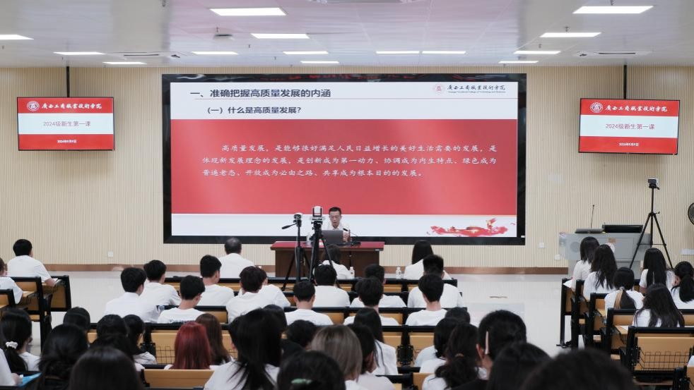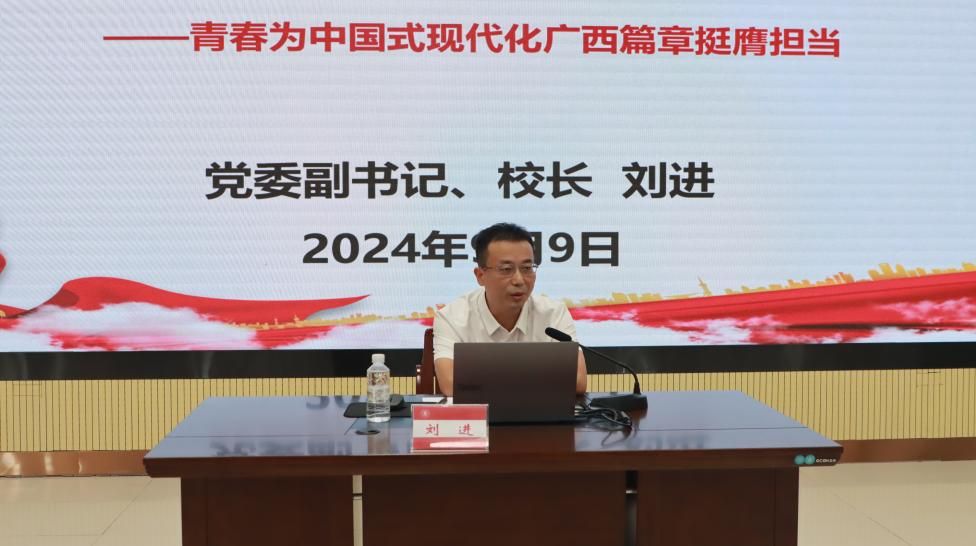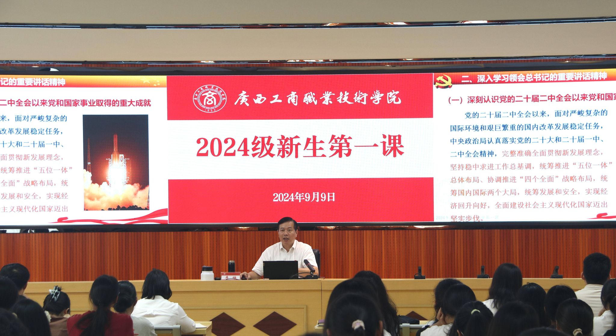 9月9日,學(xué)校開展2024級新生第一課學(xué)習教育活動,引導(dǎo)新生賡續(xù)紅色血脈,切實擔當起推動中華民族偉大復(fù)興的歷史使命。學(xué)校黨委書記李維、校長劉進、黨委副書記安仲文分別在鵬飛校區(qū)、武鳴校區(qū)、中堯校區(qū)為我校2024級新生講授“開學(xué)第一課”。此次活動以“深入學(xué)習貫徹黨的二十屆三中全會精神”為主題,采取線下講授、線上直播結(jié)合的形式展開。