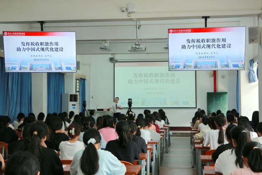安仲文副書記在中堯校區(qū)講述了題為“發(fā)揮稅收職能作用 助力中國式現(xiàn)代化建設(shè)”的課程,他從什么是中國式現(xiàn)代化、實現(xiàn)中國式現(xiàn)代化錢從哪里來、依法誠信納稅共建和諧社會三個方面進行講授。他以我國稅收制度為切入點解讀了深化財稅體制改革,指出稅收法治建設(shè)是法治國家、法治政府、法治社會建設(shè)的重要內(nèi)容,是實現(xiàn)國家治理體系和治理能力現(xiàn)代化的必然要求。他強調(diào)作為新時代青年,要以學(xué)習好貫徹好黨的二十屆三中全會精神為契機,要切實提高政治站位,深刻領(lǐng)會、準確把握黨的二十屆三中全會的重大意義、豐富內(nèi)涵、核心要義和實踐要求,切實把思想和行動統(tǒng)一到全會精神上來,踏實學(xué)習,努力奮斗,為奮力譜寫中國式現(xiàn)代化廣西篇章添磚加瓦。