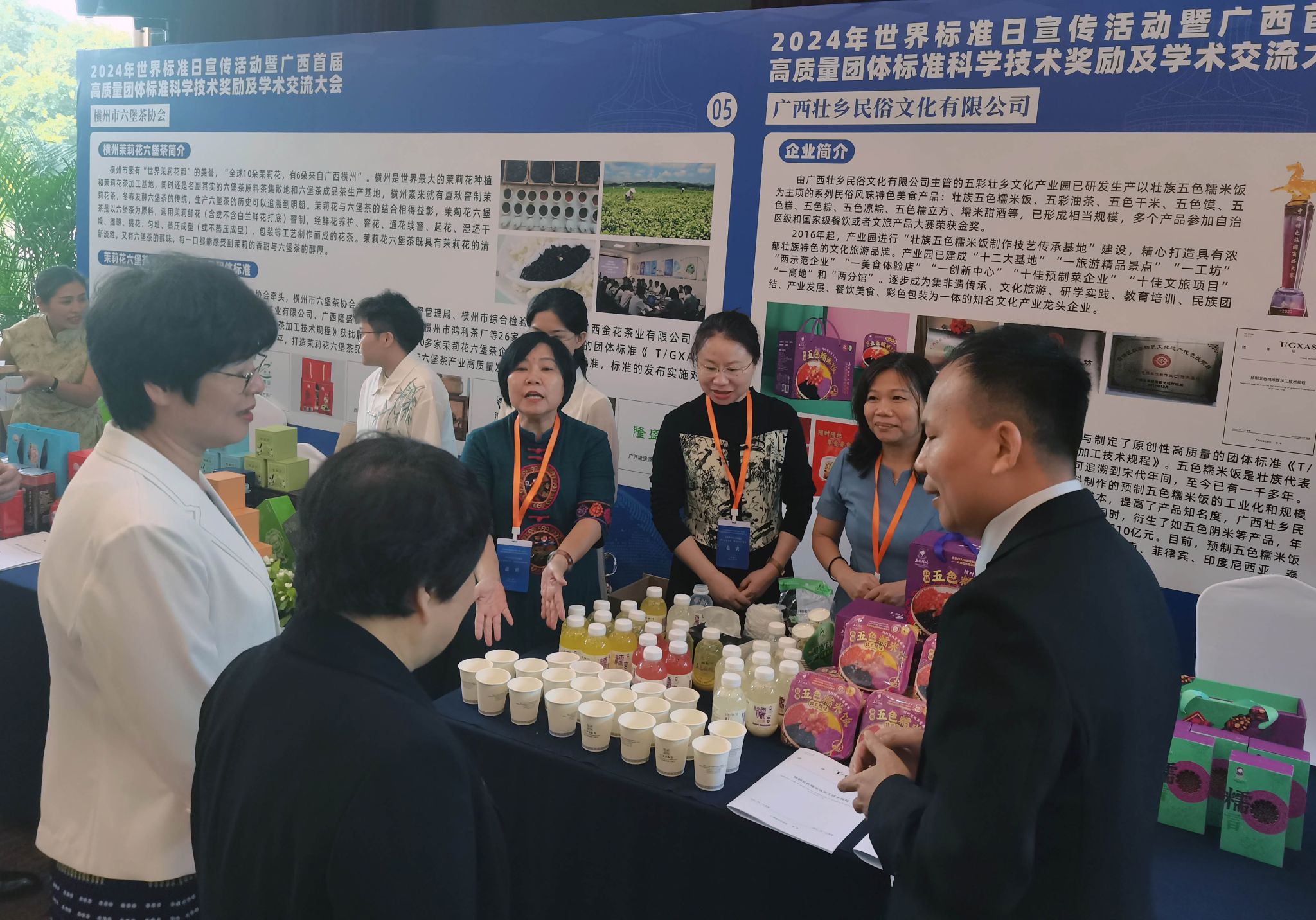 (中國標準化協會、廣西科學技術協會、廣西標準化協會等領導到預制五色糯米飯展區參觀并指導)