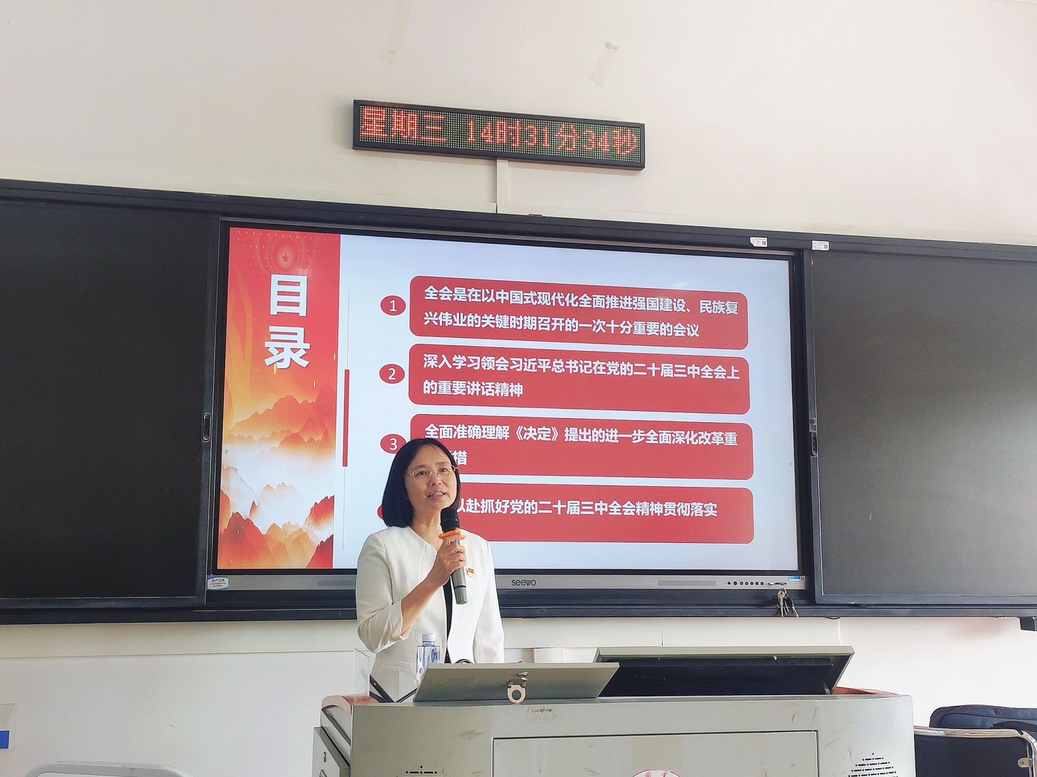 宣講中,韋云鳳詳細解讀了習近平總書記在黨的二十屆三中全會上的重要講話精神。她指出,習近平總書記的重要講話高屋建瓴、思想深邃,為我們進一步深化改革指明了前進方向、提供了根本遵循。全體教師們要深入學習領會講話精神,準確把握新時代全面深化改革的內涵和要求,切實增強改革的責任感和使命感。