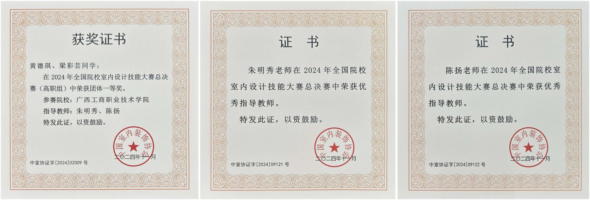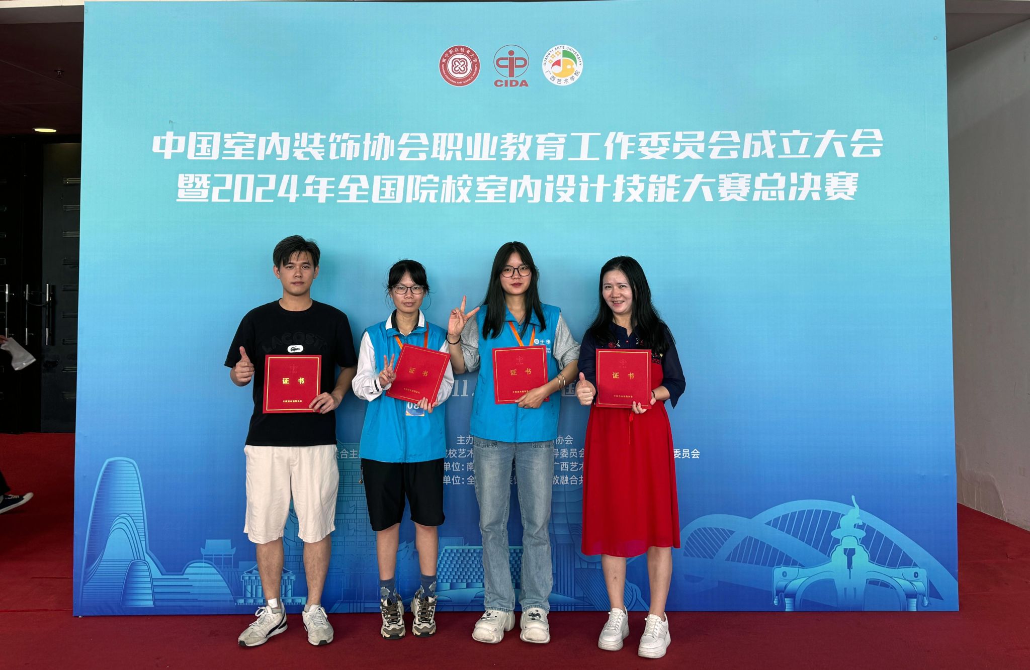 2024年11月16日,由中國室內(nèi)裝飾協(xié)會(huì)、教育部職業(yè)院校藝術(shù)設(shè)計(jì)類專業(yè)教學(xué)指導(dǎo)委員會(huì)、環(huán)境藝術(shù)設(shè)計(jì)類專業(yè)委員會(huì)組織舉辦的2024年全國院校室內(nèi)設(shè)計(jì)技能大賽總決賽在南寧國際會(huì)展中心舉行,來自來自全國168個(gè)參賽隊(duì)同臺(tái)競(jìng)技,我校朱明秀、陳揚(yáng)兩位教師指導(dǎo)的參賽隊(duì)獲得全國總決賽高職組一等獎(jiǎng)。