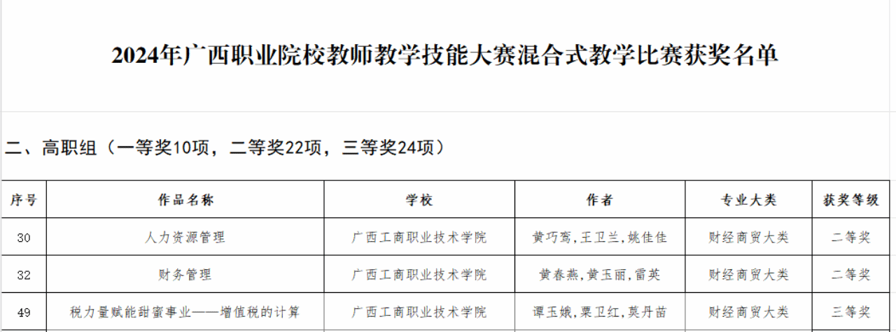 近日,自治區(qū)教育廳公布了2024年廣西職業(yè)院校教師教學(xué)技能大賽混合式教學(xué)比賽及微課教學(xué)比賽獲獎(jiǎng)名單,我校教師在比賽中榮獲佳績(jī),共獲一等獎(jiǎng)1個(gè)、二等獎(jiǎng)4個(gè)、三等獎(jiǎng)1個(gè)。