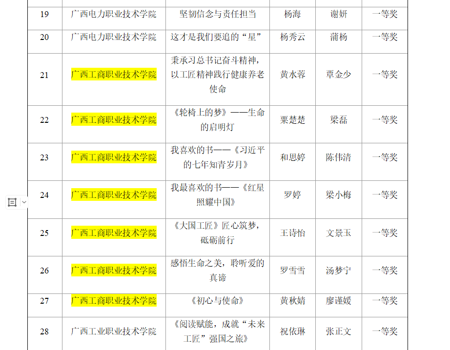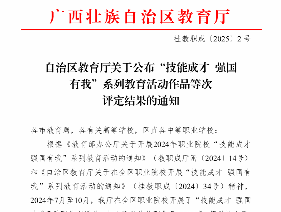 近日,自治區教育廳公布了2024年全區“技能成才 強國有我”系列教育活動作品等次評定結果,我校在此次活動中表現優異,共推薦319項作品和2個典型案例入圍區賽。經過激烈角逐,我校斬獲佳績:34項作品榮獲一等獎,68項作品榮獲二等獎,105項作品榮獲三等獎,《“歌”傳工匠心,“聲”立報國志——廣西工商職業技術學院“山歌+”育人模式創新案例》榮獲優秀典型案例。此外,學校還榮獲優秀組織獎,充分展現了我校在技能教育和人才培養方面的成果。