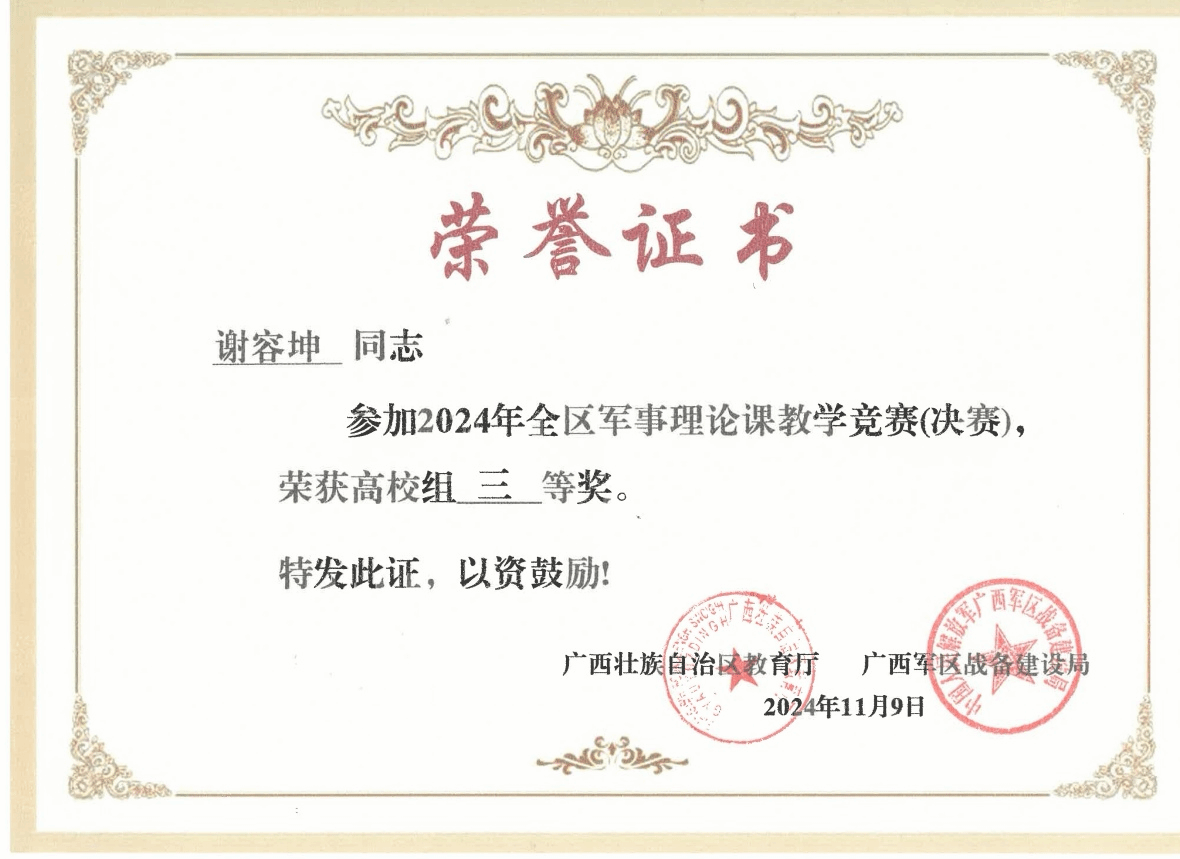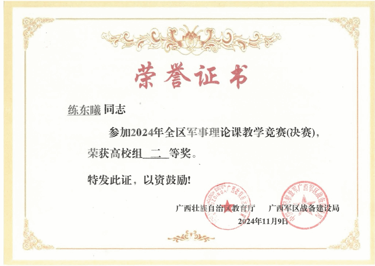 2025年3月5日至7日,廣西高校國防教育學會年會暨2025年工作會議在河池市召開。會議頒發了2024年軍事課教學競賽獲獎證書,我校張宇斐、練東曦兩位教師均榮獲二等獎,謝榮坤老師榮獲三等獎。我校張宇斐、練東曦老師參加會議并在會議上領取了由廣西壯族自治區教育廳、廣西軍區戰備建設局相關領導頒發的獲獎證書。