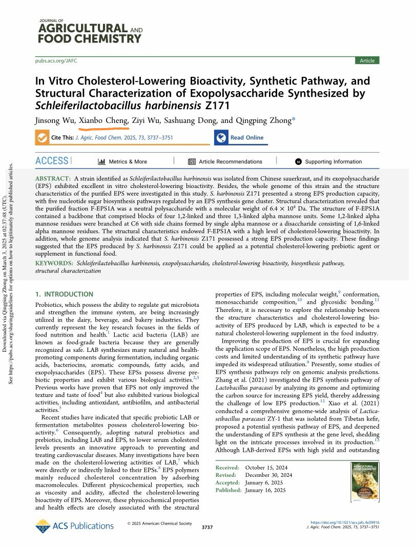 該雜志是一本在農(nóng)林科學(xué)領(lǐng)域享有高度聲譽的期刊,創(chuàng)刊于1953年,由American Chemical Society(美國化學(xué)學(xué)會)出版發(fā)行,是農(nóng)業(yè)和食品化學(xué)領(lǐng)域的老牌SCI期刊。我校承擔(dān)課題中多糖結(jié)構(gòu)的研究任務(wù),為功能性食品開發(fā)及膽固醇代謝調(diào)控提供了重要理論支持,標(biāo)志著我校在多糖領(lǐng)域的研究邁上新臺階。