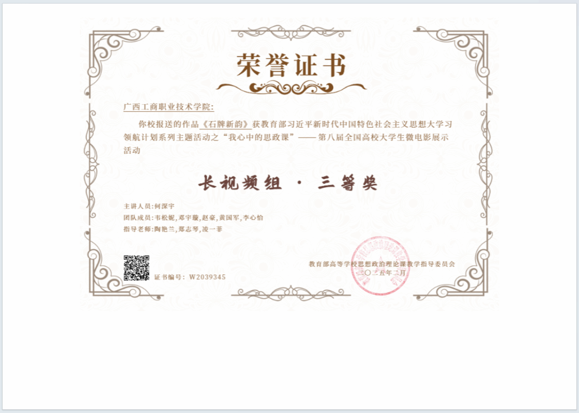 由教育部高等學校思想政治理論課教學指導委員會主辦的“七十五載薪火傳承,千秋偉業奮斗有我”——第八屆全國高校大學生講思政課公開課展示活動和“我心中的思政課”——第八屆全國高校大學生微電影展示活動圓滿結束,我校馬克思主義學院黃森曼老師團隊指導的《如何理解社會主義市場經濟的優勢》和陶艷蘭老師團隊指導的《石牌新韻》2個作品入圍國賽,經過角逐,均榮獲三等獎。這是我校第三年獲此榮譽。