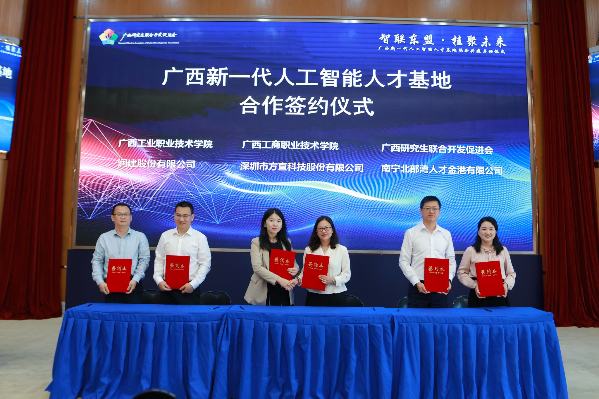 在與會嘉賓的共同見證下,鄭華副校長與其他39家單位代表上臺簽署《廣西新一代人工智能人才基地聯合共建聲明》,并與深圳市方直科技股份有限公司簽訂校企合作框架協議,開啟了政校行企合作共育人才的新篇章。