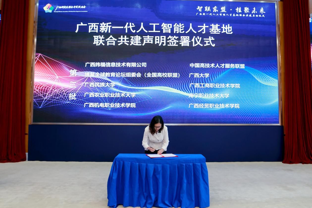 為深入貫徹落實國家《新一代人工智能發展規劃》及廣西壯族自治區“數字強區”戰略部署,建立產、科、教、人一體化數字產業人才培育體系,2025年4月28日,廣西新一代人工智能人才基地聯合共建啟動儀式在南寧高新區中關村創新示范基地舉行。來自全區 40 家政、產、學、研、金、用單位代表共同簽署《聯合共建聲明》,標志著廣西在人工智能人才培養、技術創新與產業融合領域邁出關鍵性一步,正式開啟面向東盟的數字經濟人才高地建設新征程。我校作為共建單位之一簽署《聯合共建聲明》,并協辦此次啟動儀式。