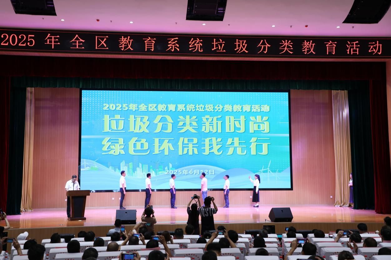 隨后,萬鋒鋒、謝增來、梁鵬昌、林昆榮以及我校師生代表上臺,共同按下活動啟動鍵,全體與會人員共同見證綠色征程的開啟。這象征著2025年全區教育系統垃圾分類教育巡講活動正式啟動,也標志著全區垃圾分類教育進入新階段。