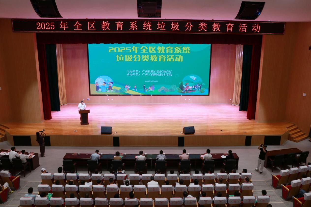 為深入貫徹落實習近平總書記關于垃圾分類系列重要指示精神,落實國家和自治區有關部署要求,進一步提升全區校園生活垃圾分類工作成效,2025年6月12日,由自治區教育廳主辦、廣西工商職業技術學院承辦,以“垃圾分類新時尚,綠色環保我先行”為主題的全區教育系統垃圾分類教育活動在我校武鳴校區舉行,自治區教育廳體育衛生與藝術教育處處長萬鋒鋒、自治區住房和城鄉建設廳城市管理監督局二級調研員謝增來、自治區教育廳體育衛生與藝術教育處二級調研員李春春、南寧市武鳴區住房和城鄉建設局副局長梁鵬昌,以及全區各高等學校后勤處處長,各市教育局副局長或業務部門負責人,各市直屬小學、初中、高中階段校長和我校師生代表共計500多人參加活動。學校黨委副書記、校長劉進出席參加啟動儀式并講話,副校長陳寧春主持啟動儀式。