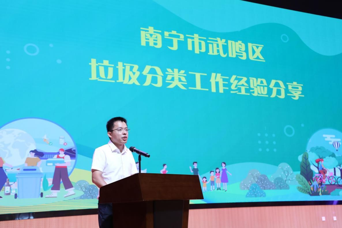南寧市武鳴區住房和城鄉建設局副局長梁鵬昌作生活垃圾分類工作經驗分享,向與會人員介紹了“政府主導、部門協同、社會參與、全民行動”的垃圾分類工作格局。我校后勤管理處處長林昆榮作垃圾分類工作經驗分享,介紹學校垃圾分類工作具體做法,為大家提供了可復制的經板模板和多元化的垃圾分類工作思路。