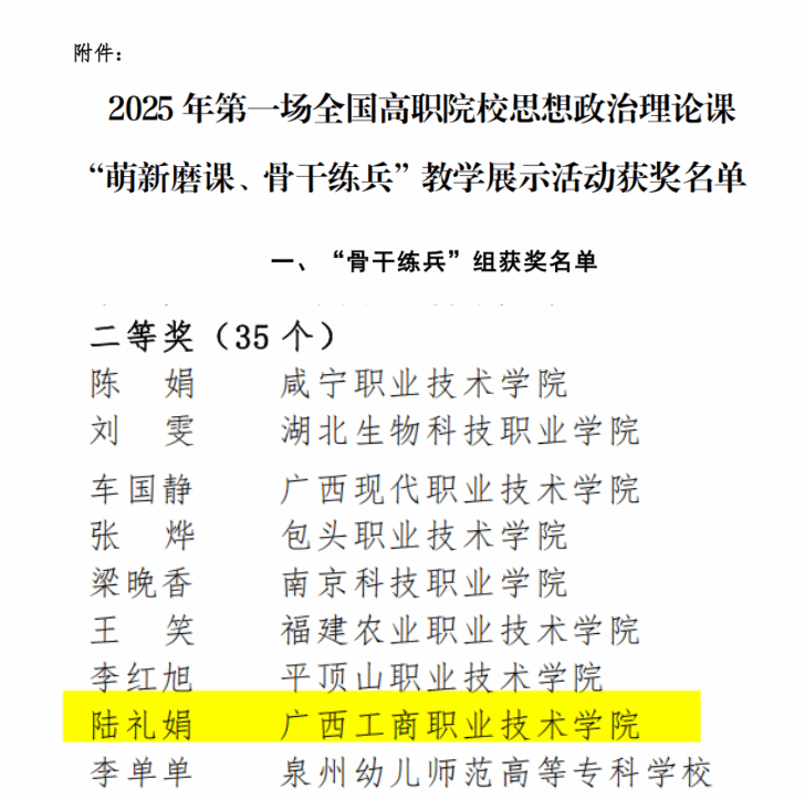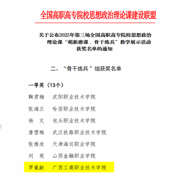 近日,2025年全國高職院校思想政治理論課“萌新磨課、骨干練兵”教學(xué)展示活動(dòng)評(píng)選結(jié)果公布。本次活動(dòng)按照不同課程分為三場,包含萌新磨課”和“骨干練兵”兩大組別,“省內(nèi)初選、線上復(fù)選、現(xiàn)場展示”等三個(gè)環(huán)節(jié)。我校馬克思主義學(xué)院教師羅氰獻(xiàn)榮獲第三場“骨干練兵”組一等獎(jiǎng),陸禮娟榮獲第一場“骨干練兵”組二等獎(jiǎng)。