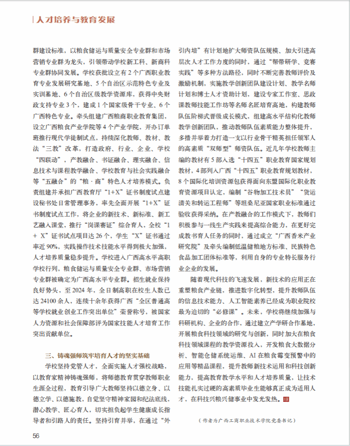 近日,《中國糧食經(jīng)濟》刊發(fā)學校黨委書記李維署名文章,標題為《廣西工商職業(yè)技術(shù)學院:產(chǎn)教融合 科教融匯 奮力譜寫糧安人才培養(yǎng)新篇章》,全文如下: