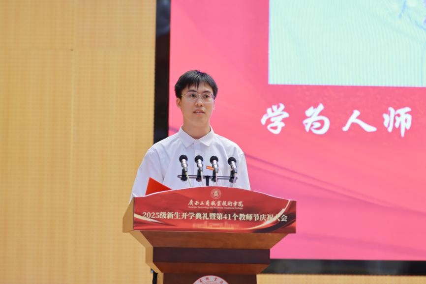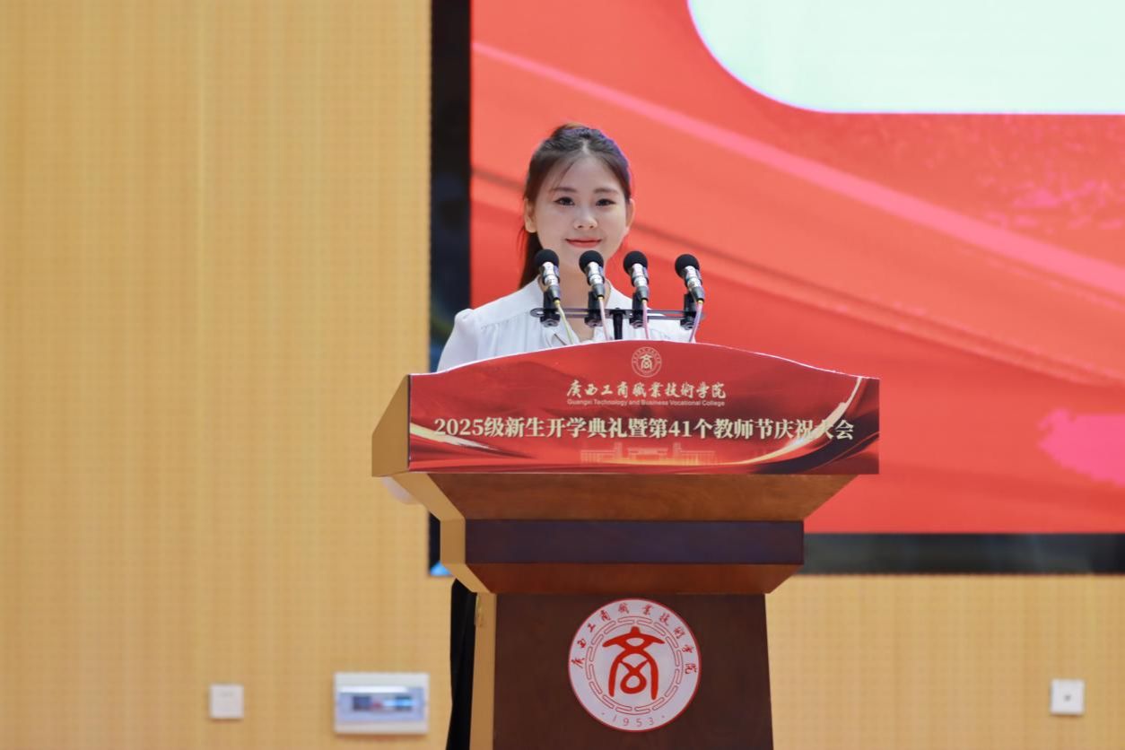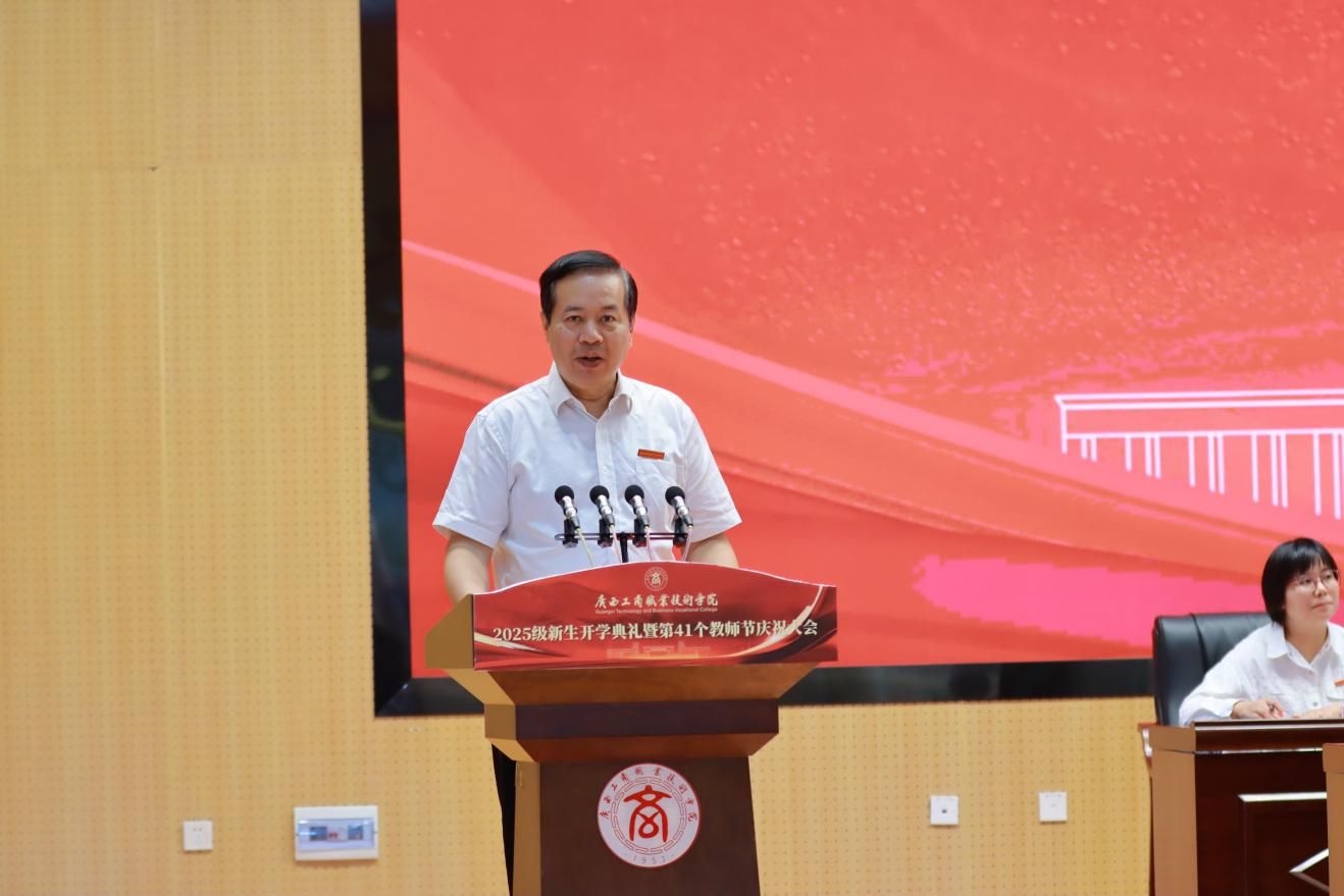 為熱烈歡迎2025級新生入學,隆重慶祝第41個教師節,9月10日,學校以線上線下相結合的方式在武鳴校區、鵬飛校區、中堯校區同步舉行2025級新生開學典禮暨第41個教師節慶祝大會。學校領導李維、劉進、安仲文、韋云鳳、陳寧春、闕勇平、鄭華,各部門、各單位主要負責人,受表彰教師代表,新入職教師代表,武鳴校區2025級輔導員代表和2025級新生代表在線下主會場參會,全體2025級新生及各部門、各單位教職工在線上參會。學校黨委副書記安仲文主持大會。