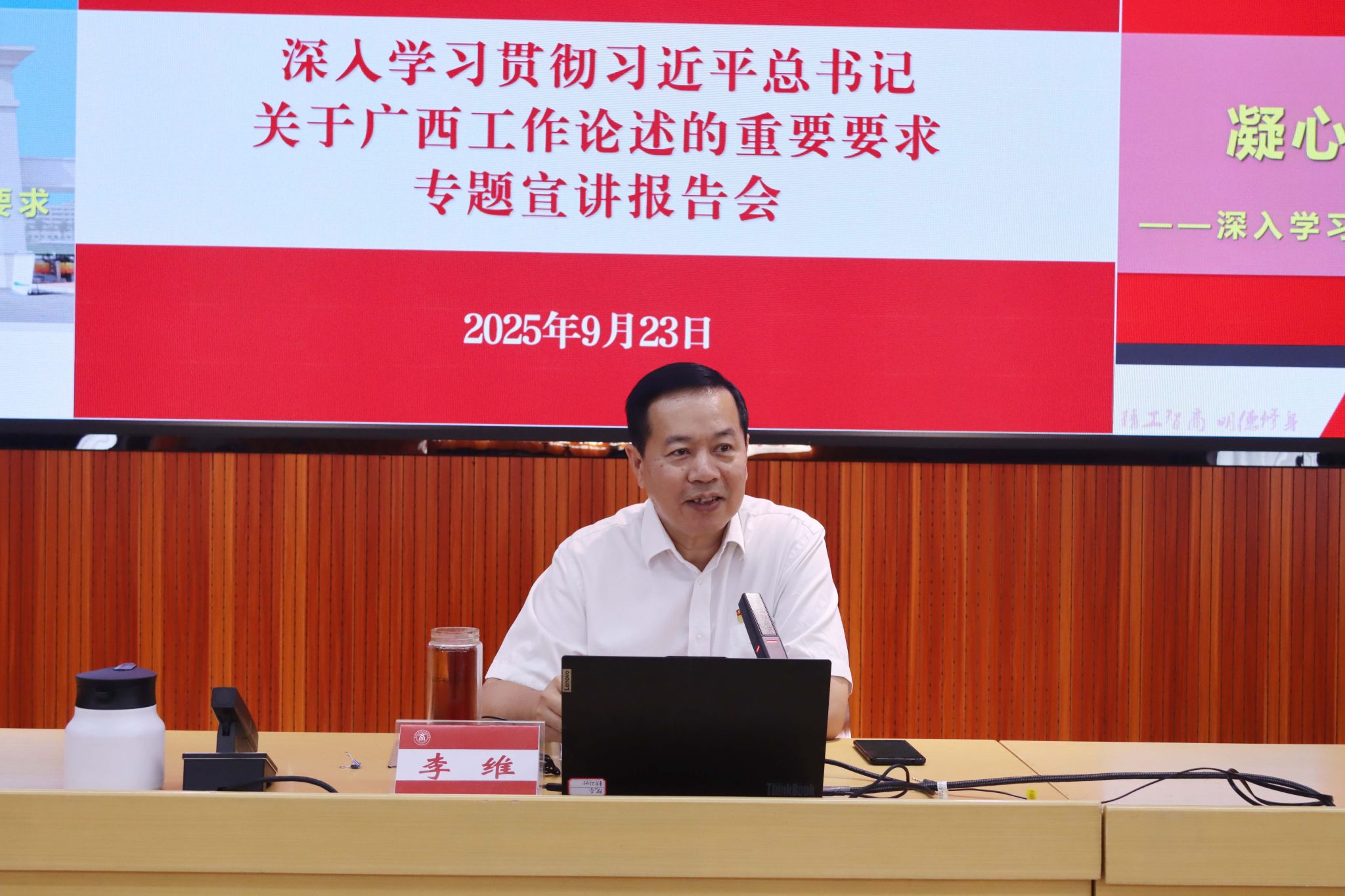 為深入學習貫徹習近平總書記關于廣西工作論述的重要要求,鑄牢中華民族共同體意識,推動黨的創新理論有效觸達青年群體,根據自治區黨委宣傳部《理論宣講青年群體全覆蓋三年行動計劃工作方案》安排,9月23日,學校在鵬飛校區舉辦深入學習貫徹習近平總書記關于廣西工作論述的重要要求專題宣講報告會,學校黨委書記李維作題為《凝心聚力建設新時代壯美廣西——深入學習貫徹習近平總書記關于廣西工作論述的重要要求》的專題宣講報告。宣講報告會采取線下講授、線上直播結合的形式展開,全體在校生聽取報告會。