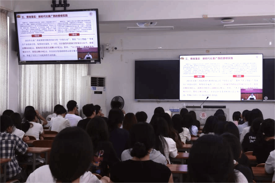 李維書記在宣講報告中指出,習近平總書記對廣西工作高度重視,多次親臨廣西考察調研,多次就廣西工作發表重要講話、作出重要指示批示,深刻闡明了事關廣西發展全局的根本性、方向性、戰略性問題,為建設新時代壯美廣西樹立了新的歷史坐標、提供了新的戰略指引。他強調,學校經過70多年的接續奮斗,各項建設走上高質量發展的快車道。學校黨委將進一步全面深化改革、開拓創新、砥礪奮進,牢固樹立“實干為要、創新為魂,用業績說話、讓人民評價”的鮮明導向,圍繞落實立德樹人根本任務,堅持提質量、強效能、穩保障、惠民生,提高辦學水平、增強綜合實力、實現學校高質量發展。他勉勵學校學子,要牢記習近平總書記殷切囑托,堅定不移聽黨話、跟黨走,爭做有理想、敢擔當、能吃苦、肯奮斗的新時代好青年,在推進強國建設、民族復興偉業中展現作為、彰顯風采、貢獻力量,奮力書寫中國式現代化廣西篇章的青春答卷。