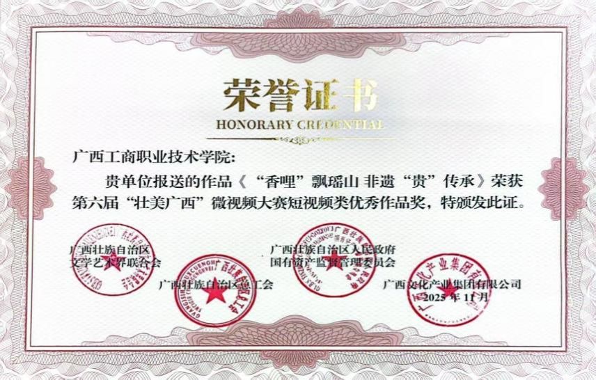 2025年11月28日,由自治區文聯、自治區國資委、自治區總工會、廣西文化產業集團聯合主辦的第六屆“壯美廣西”微視頻大賽頒獎儀式在南寧舉行。本次大賽共征集各類參賽作品672部,其中微電影59部、短視頻613部。經過初評、復評及網絡傳播熱度綜合評審,最終評選出82部獲獎作品和最佳導演獎1名。我校報送的短視頻《“香哩”飄瑤山 非遺“貴”傳承》在眾多參賽作品中脫穎而出,斬獲短視頻類優秀作品獎。