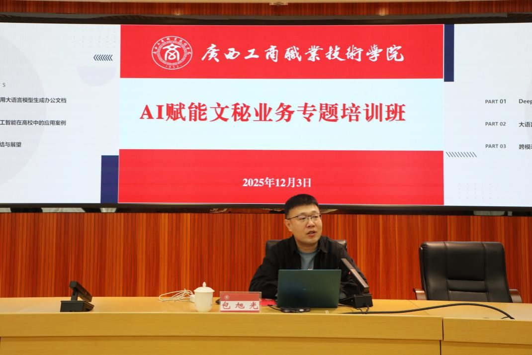 為進一步加強辦文管理、規范辦文行為,深入落實人工智能賦能學校高質量發展行動計劃,提升辦文質效,2025年12月3日上午,學校在鵬飛校區教學樓2145會議室舉辦2025年AI賦能文秘業務專題培訓班。本次培訓特邀桂林電子科技大學計算機與信息安全學院包旭光教授來校授課。各部門、各單位OA秘書、2024年以來新入職教職工以及有意愿了解文秘業務的教職工參加培訓。培訓由黨委辦公室(學院辦公室)副主任、督查室主任張秋君主持。