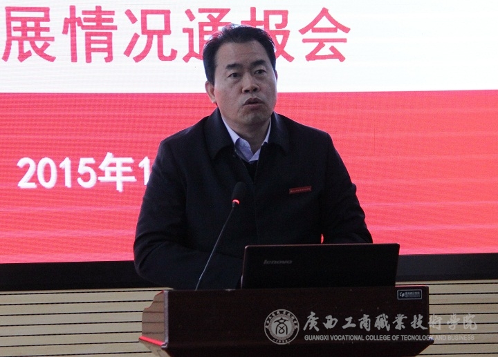 2015年12月16日下午2點40分我院在2119教室召開“三嚴三實”專題教育進展情況通報會。學院黨委書記覃武云、學院院長陳杰、副廳級調研員黃永蓬和學院全體在職黨員、學院副高職稱及以上教師、學院教代會代表等參加了會議。會議由陳杰院長主持,覃武云書記做專題報告。