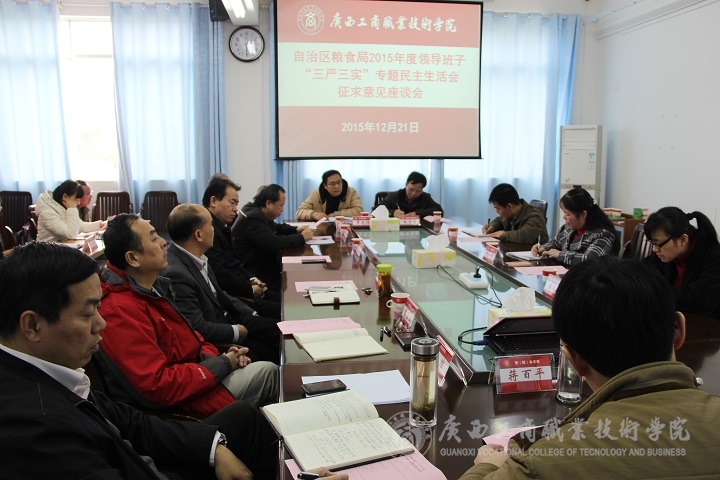 2015年12月21日下午3時,自治區糧食局機關黨委負責同志冼一紫等一行三人前來我院組織召開“自治區糧食局領導班子‘三嚴三實’專題民主生活會征求意見座談會”。我院領導班子全體成員,各黨政教輔部門負責人、黨支部負責人、各系黨支部負責人參與了本次座談會。