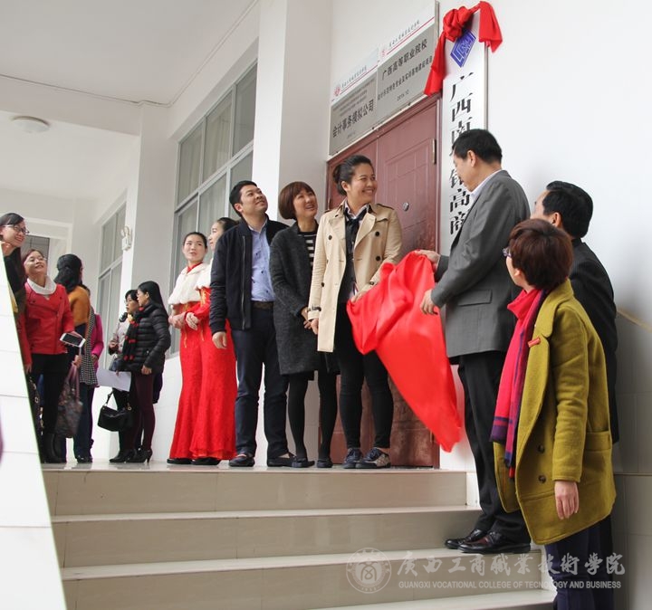 隨后與會人員移步到了328實訓室,企業代表廣西南寧銘高商務有限公司總經理黃淇和學院代表李維副院長進行揭牌,廣西南寧銘高商務有限公司正式在學院落戶,校企合作揭牌儀式在熱烈掌聲中落下帷幕!