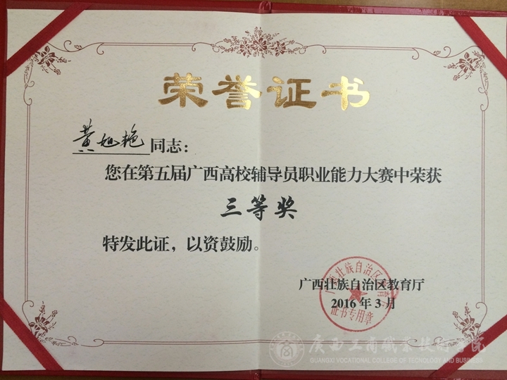 2016年3月21-23日,由自治區高校工委、自治區教育廳主辦,廣西高校輔導員培訓和研修基地承辦的第五屆廣西高校輔導員職業能力大賽在廣西大學舉辦。來自全區60多所高校的88名輔導員參與大賽的角逐,在主題班會視頻、基礎知識測試、博文寫作、案例分析、主題演講等比賽環節中,我院黃旭艷老師憑借扎實的理論功底、過硬的專業技能和優秀的職業素養獲得了三等獎,這也是我校目前在廣西高校輔導員職業能力大賽中獲得的最好成績。