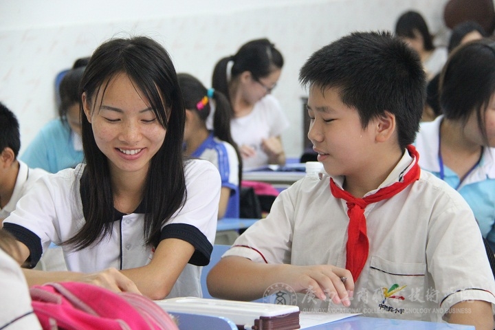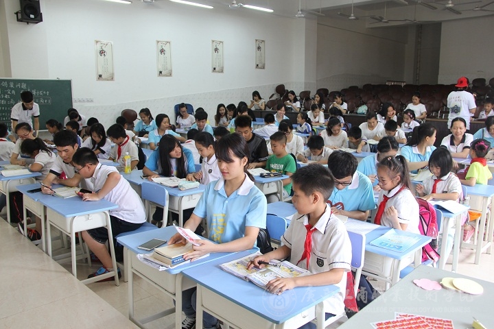 ??????? 隨著輕快的下課鈴聲,小朋友們來到教室,準(zhǔn)備上一堂特殊的課程。然而,可愛的小朋友們并沒有想象中的調(diào)皮。初次與“小老師”們接觸,大部分小朋友們顯得靦腆和害羞,經(jīng)過交談后才顯得放松,教室內(nèi)歡笑聲也逐漸多了起來。有的“小老師”在指導(dǎo)做作業(yè)、有的輔助預(yù)習(xí)、有的在復(fù)習(xí)。急促的下課鈴聲響起,一節(jié)課很快就結(jié)束了,小朋友們收拾好沉重的書包與“老師”們道別便匆匆離開了。支教的圓滿落幕,周末也隨之來臨。揮手之間告別的不止是小朋友們,還有那緊張的學(xué)習(xí)日。