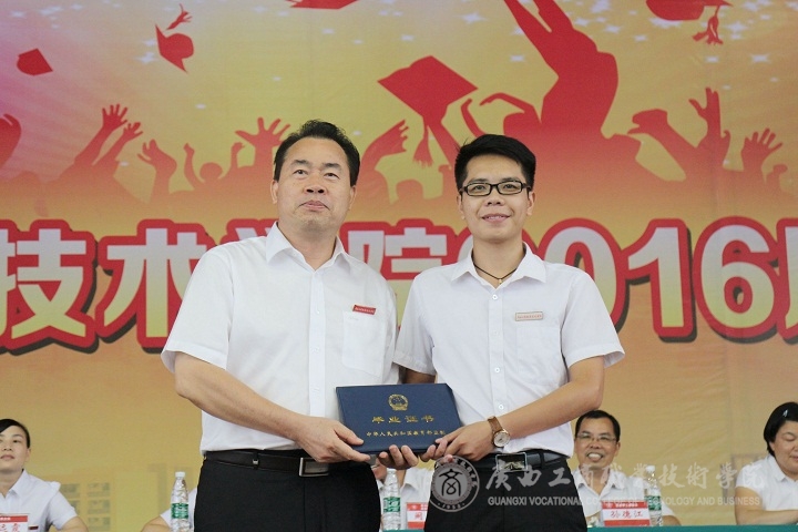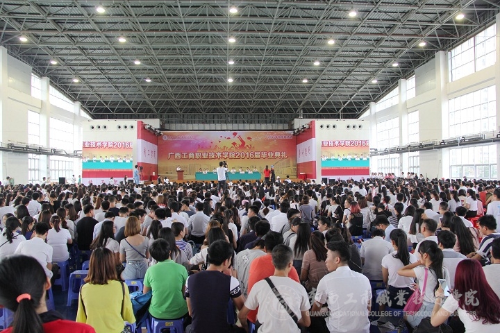 ??????? 又是紫荊花開時,又是一年畢業季,“學海浩瀚,憑誰鵬飛起航。光華歲月,任我青春飛揚。”悠揚激蕩的《廣商院之歌》不時在鵬飛路上空回蕩,燦爛的陽光輝映著廣商院美麗的校園,文體館內陣陣清風撲面而來。2016年6月26日下午,廣西工商職業技術學院2016屆畢業典禮在校本部文體館二樓隆重舉行。學院黨委書記覃武云、院長陳杰等校領導、學院各部門主要負責人出席,2016屆2200多位畢業生及班主任參加。畢業典禮由蒙啟成副書記主持。