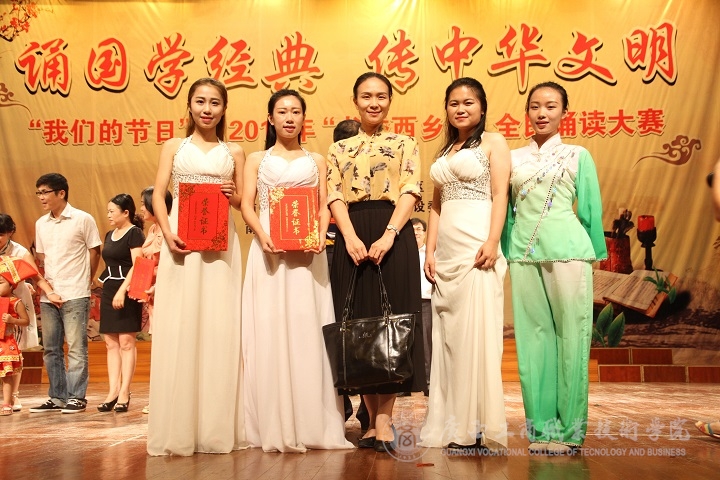 2016年6月16日,在廣西財經學院舉辦中共南寧市西鄉塘區委宣傳部、南寧市西鄉塘區精神文明建設委員會、南寧市西鄉塘區總工會主辦“誦國學經典,傳中華文明”的比賽。由我院公共基礎部梁曉霞老師率隊,帶領學院韋思凡、吳梅蓮、覃蕾三名同學參加比賽。在國家級普通話測試員梁曉霞老師的指導下,我院參賽選手詩朗誦朱自清《春》,取得以9.52分的成績,奪得此次比賽的一等獎。