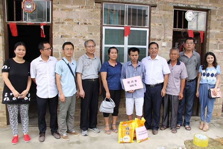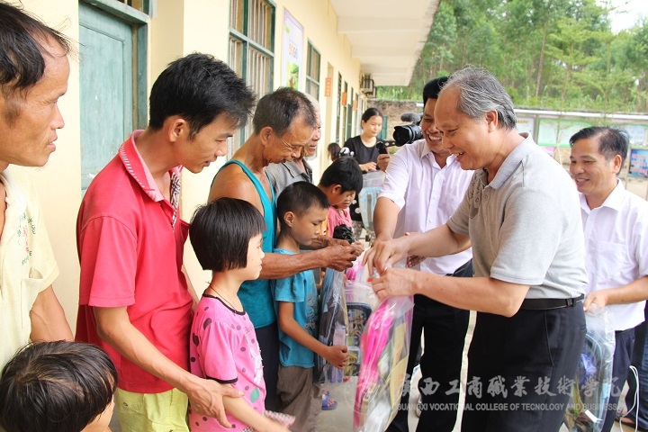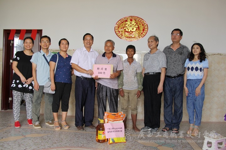 2016年7月8日,學院黃永蓬副廳級調研員率黨委宣傳部部長韋勝強、后勤管理處處長付光、宣傳部黨員教師等一行五人前往陸川縣看望駐四樂村第一書記羅北戰同志,走訪慰問該村老黨員、困難黨員、困難群眾,并為當地小學困難學子捐獻學習用品。