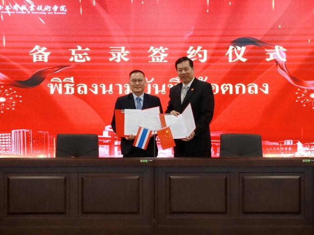 在友好融洽的氛圍中,李維院長與宋才·孟泰松校長代表雙方簽署教育合作備忘錄,李維院長代表學院向清萊皇家大學贈送特色禮物。