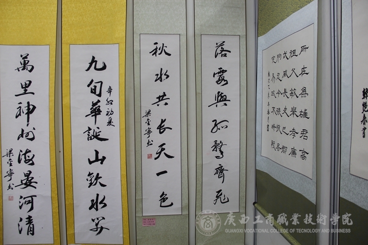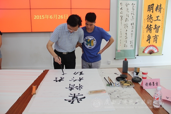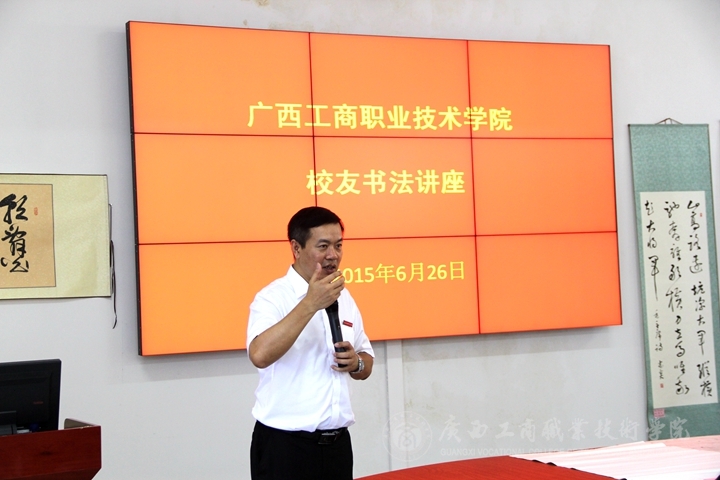 此次書法講座會上,廣西書法家協會常務副主席劉德宏上臺給在場各位講評了“書法有道”的概念。同大家觀看了一些自己的書法作品并熱情的與大家分享自己的創作心得以及自己在書法道路上的故事。接著自治區糧食局人事處處長韋尚英上臺發表講話,向大家講起了往年自己參加的一些書法比賽,就如何提高同學們對書法的興趣、書法基礎要領、如何寫好書法等問題做了詳細的講解并給同學們示范了一些字的點筆與勾勒。
