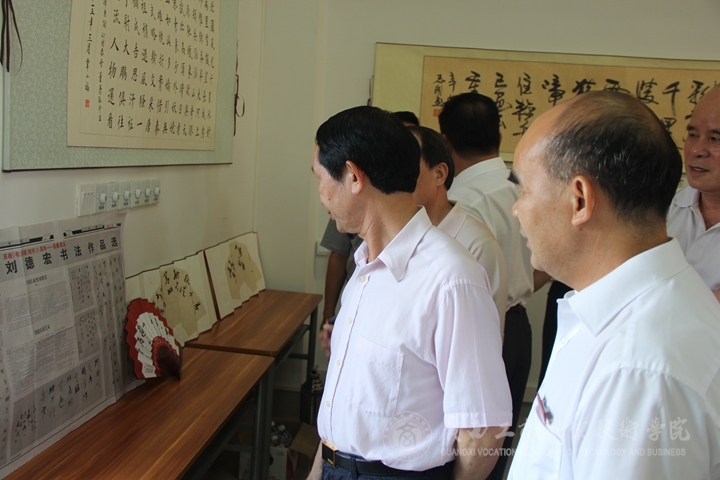 隨后,學院領導陪同老領導一起觀摩了陳列在展廳里校友和我院師生的一些優秀書法作品,與學生互動提問、交流。