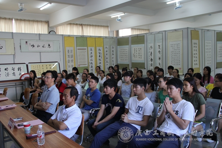 2015年6月26日下午,我院在校本部教學樓2514創業實訓中心召開校慶日校友書法講座。原財會792班校友、中國書法家協會理事、廣西書法家協會常務副主席劉德宏,原計統821班校友,自治區糧食局人事處處長韋尚英,學院副院長李維,檔案館籌建辦副主任韋小福,黨(院)辦副主任高潔,學院鴻軒書畫協會的學生代表及13級學生代表參加了書法講座。座談會由李維副院長主持。