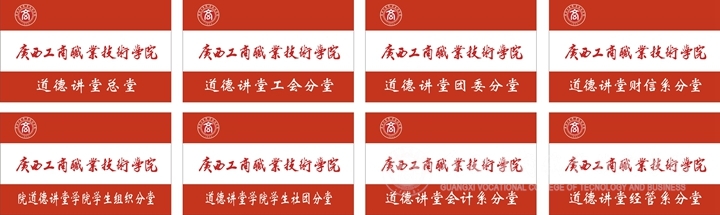 在道德講堂硬件布置上,我院突出 “以德育商”元素,體現商院特色,設計了專門的“道德講堂”統一LOGO標識、講堂背景板、道德箴言掛板及紀念品。并為道德講堂總堂、工會分堂、團委分堂、學院學生組織分堂、學院學生社團分堂和各系分堂制作了專門的“廣商育人紅”道德講堂旗幟。