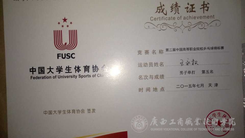 第二屆全國高等職業(yè)院校乒乓球錦標(biāo)賽于2015年7月20-23日在天津電子信息職業(yè)技術(shù)學(xué)院舉行。我院派出了由會(huì)計(jì)系稅會(huì)1432班王永權(quán)、會(huì)審1331班潘凌歡、會(huì)審1432班鄭琪雲(yún)、經(jīng)管系工商1434班黃瑞和、營銷1331班趙海榮同學(xué)組成的學(xué)院代表隊(duì),赴天津參加了本次高職乒乓球盛會(huì)。我院代表隊(duì)在比賽中發(fā)揚(yáng)了良好的體育道德精神,互相鼓勵(lì),頑強(qiáng)拼搏,經(jīng)過4天激烈角逐,獲得了男子團(tuán)體第五名的驕人成績,創(chuàng)造了我院參加全國體育比賽的最好名次。同時(shí),在有187名運(yùn)動(dòng)員所參加的男子單打比賽中,我院王永權(quán)同學(xué)憑著多變的戰(zhàn)術(shù),穩(wěn)定的心理,頑強(qiáng)的精神,兇狠的打法,連克強(qiáng)手,榮獲男子單打第五名。