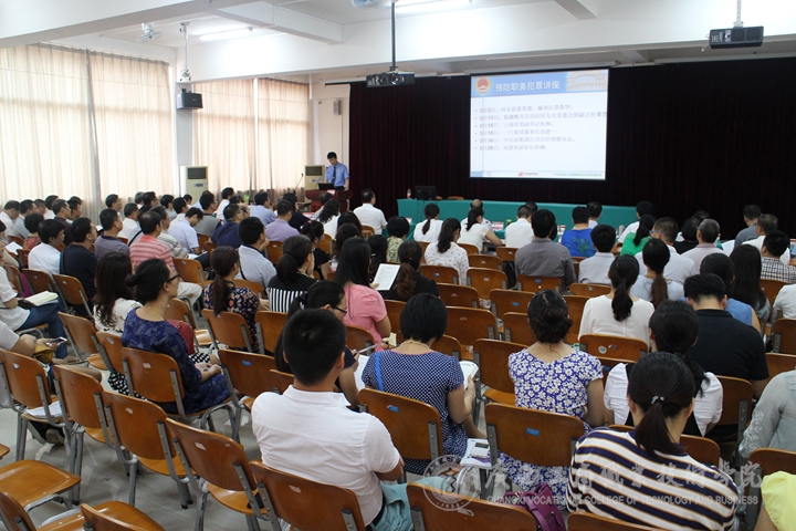 張堅局長在講座中結合自身多年從事檢察工作的豐富經驗,列舉了當今社會大量的典型案例,全面、生動、形象地為大家深刻剖析了當前職務犯罪的形勢、職務犯罪易發的心理、職務犯罪的危害、認定受賄罪的若干問題、高校職務犯罪常見問題及案例等職務犯罪相關問題。講座中還播放了相關案例視頻及廉政宣傳短片、公益廣告。張堅局長以極其嚴謹科學的態度、風趣幽默的方式、振聾發聵的效果為與會的干部作了一次生動的預防職務犯罪專題講座,使大家受到了強烈的震撼和深刻的教育。