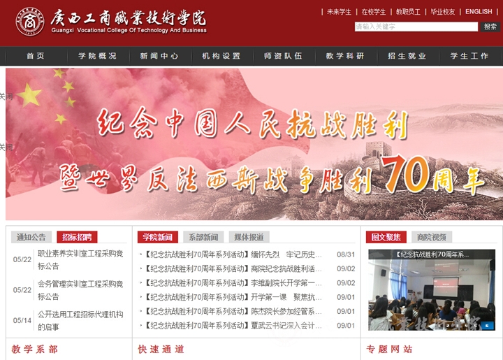 利用網絡平臺擴大紀念活動受眾。在學院網站主頁開設了紀念中國人民抗日戰爭勝利70周年“網上祭英烈”的網頁。并組織全校師生員工登錄學院網站主頁,向抗戰英烈鮮花留言,在網上高揚愛國主義主旋律,凝聚牢記歷史、圓夢中華的網上正能量。在學院主頁最顯著的頭圖位置更新主題為紀念中國人民抗日戰爭暨世界反法西斯戰爭勝利70周年圖片,在網絡平臺上營造濃厚的紀念氛圍。同時,利用微信、微博等新媒體推送紀念抗戰勝利70周年相關內容,多渠道擴大紀念活動受眾。