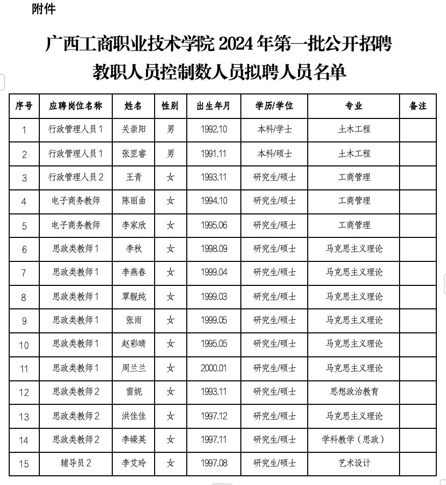 附件:廣西工商職業技術學院2024年第一批公開招聘教職人員控制數人員擬聘人員名單