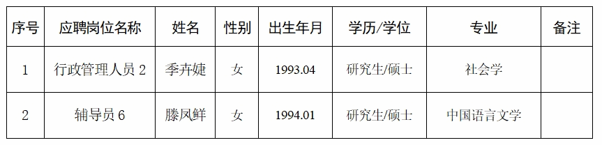 根據(jù)《廣西壯族自治區(qū)事業(yè)單位公開招聘人員實施辦法》(桂人社發(fā)﹝2011﹞155號)、《關(guān)于進一步規(guī)范區(qū)直事業(yè)單位公開招聘工作的通知》(桂人社辦發(fā)〔2013〕135號)、《關(guān)于進一步完善事業(yè)單位公開招聘工作的通知》(桂人社規(guī)〔2021〕7號)和《廣西工商職業(yè)技術(shù)學院2023年第一批公開招聘非實名人員控制數(shù)人員公告》相關(guān)規(guī)定,經(jīng)公開招聘規(guī)定的程序,經(jīng)研究,擬聘用季卉婕等2位同志到我院工作,現(xiàn)將擬聘人員名單(第四輪)予以公示,公示期為7日(2023年9月15日至2023年9月21日)。公示期內(nèi)如對擬聘人員有異議,請以書面形式,并署真實姓名、聯(lián)系方式及聯(lián)系地址,于2023年9月21日18:00前寄送到廣西工商職業(yè)技術(shù)學院人事處(直接送達以送達日期為準,郵寄以寄出郵戳為準)。地址:廣西南寧市鵬飛路15號廣西工商職業(yè)技術(shù)學院人事處(2212辦公室);聯(lián)系人:韋老師、李老師;郵編:530008;電話:0771-3160065。如實反映擬聘用人員的有關(guān)問題受法律保護。