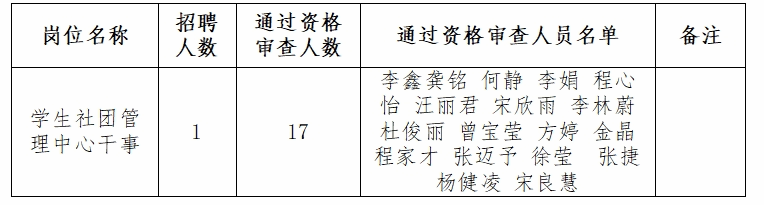 廣西工商職業(yè)技術(shù)學(xué)院2023年第二批公開(kāi)招聘非實(shí)名人員控制數(shù)人員報(bào)名工作已結(jié)束。經(jīng)資格審查,資格審查通過(guò)名單已于2023年10月25日在我院官網(wǎng)公布。經(jīng)對(duì)照相關(guān)崗位條件進(jìn)行核查,現(xiàn)將學(xué)生社團(tuán)管理中心干事崗位資格審查通過(guò)人員名單進(jìn)行補(bǔ)充公告如下: