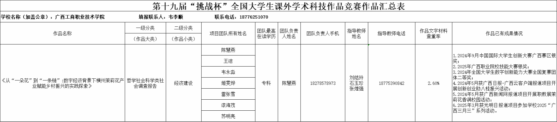 附件:第十九屆“挑戰杯”全國大學生課外學術科技作品競賽作品匯總表