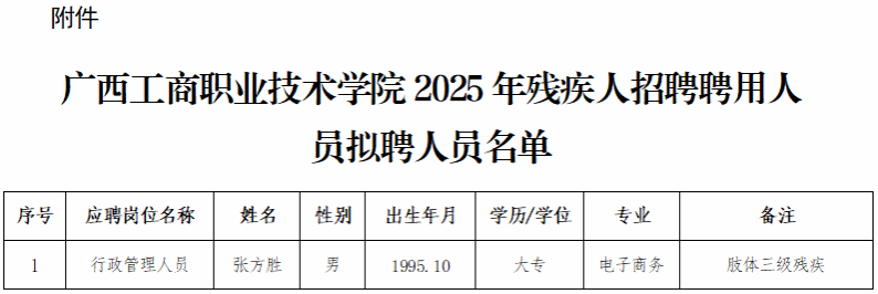 根據《廣西壯族自治區機關、事業單位、國有企業帶頭安排殘疾人就業實施辦法》(桂殘聯字〔2022〕15號)及有關文件精神,結合本單位實際工作需要,我校在中國殘疾人就業創業網絡服務平臺發布殘疾人招聘崗位信息。經報名、資格審查、綜合考核、思想政治素質考核、體檢等程序,經研究,擬聘用張方勝同志到我校工作,現將擬聘人員予以公示,公示期為7日(2025年10月23日至2025年10月29日)。公示期內如對擬聘人員有異議,請以書面形式,并署真實姓名、聯系方式及聯系地址,于2025年10月29日18時前寄送到廣西工商職業技術學院人事處(直接送達以送達日期為準,郵寄以寄出郵戳為準)。地址:廣西南寧市鵬飛路15號廣西工商職業技術學院人事處(2415辦公室);聯系人:周老師、李老師;郵編:530008;電話:0771-3160065。如實反映擬聘用人員的有關問題受法律保護。