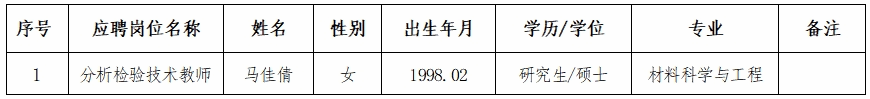 根據《廣西壯族自治區事業單位公開招聘人員實施辦法》(桂人社發〔2011〕155號)、《關于進一步規范區直事業單位公開招聘工作的通知》(桂人社辦發〔2013〕135號)、《關于進一步完善事業單位公開招聘工作的通知》(桂人社規〔2021〕7號)和《廣西工商職業技術學院2023年第二批公開招聘非實名人員控制數人員公告》相關規定,經公開招聘規定的程序,經研究,擬聘用馬佳倩同志到我院工作,現將擬聘人員名單(第三輪)予以公示,公示期為7日(2024年4月1日至2024年4月7日)。公示期內如對擬聘人員有異議,請以書面形式,并署真實姓名、聯系方式及聯系地址,于2024年4月7日18時前寄送到廣西工商職業技術學院人事處(直接送達以送達日期為準,郵寄以寄出郵戳為準)。地址:廣西南寧市鵬飛路15號廣西工商職業技術學院人事處(2212辦公室);聯系人:李老師、詹老師;郵編:530008;電話:0771-3160065。如實反映擬聘用人員的有關問題受法律保護。