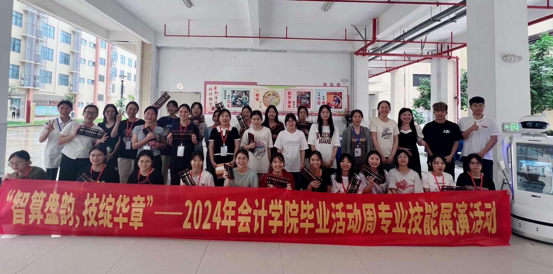 為了在2024年畢業活動周上全面展示智慧會計專業群的特色和專業建設成果,會計學院2024年6月26日下午在武鳴校區A5架空層舉辦“乘珠算之韻味,展技能之風華”技能比賽,以珠算競賽和財務機器人對話的方式展示傳統會計文化與數字經濟時代會計的發展。