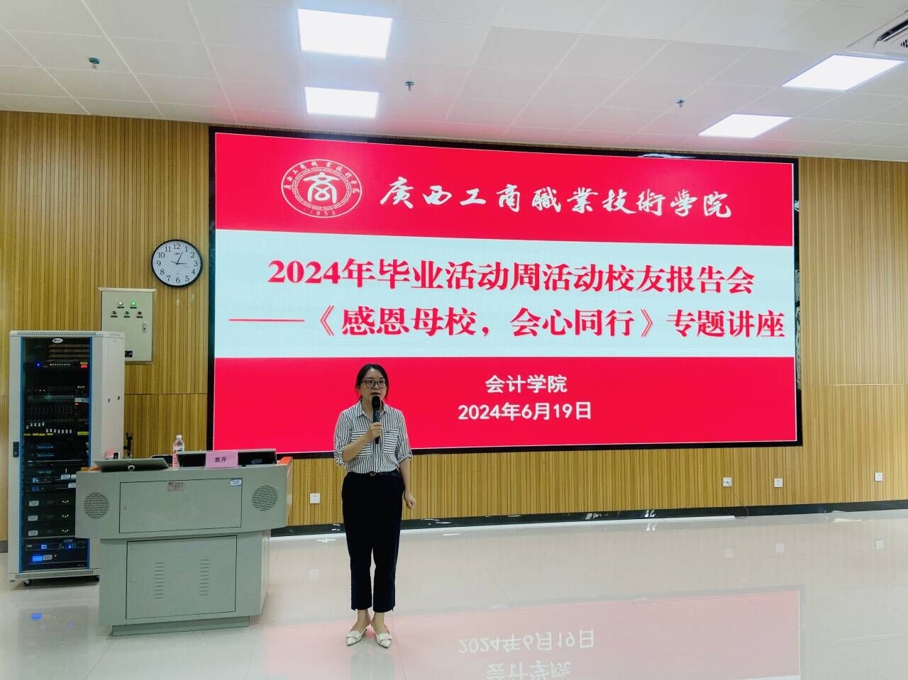6月19日下午,會計學院2024年畢業活動周活動校友報告會——《感恩母校,會心同行》專題講座在A5-102階梯教室舉行。優秀校友袁開同志(原2004級電子商務專業畢業生),現任廣西布道天下信息產業有限公司創始人兼總經理受邀作為主講嘉賓從職場致勝、感恩母校及創業經歷等方面為師生們帶來了一場的精彩講座。會計學院教師以及2022級全體學生參加會議,會議由會計學院副院長譚玉娥主持。