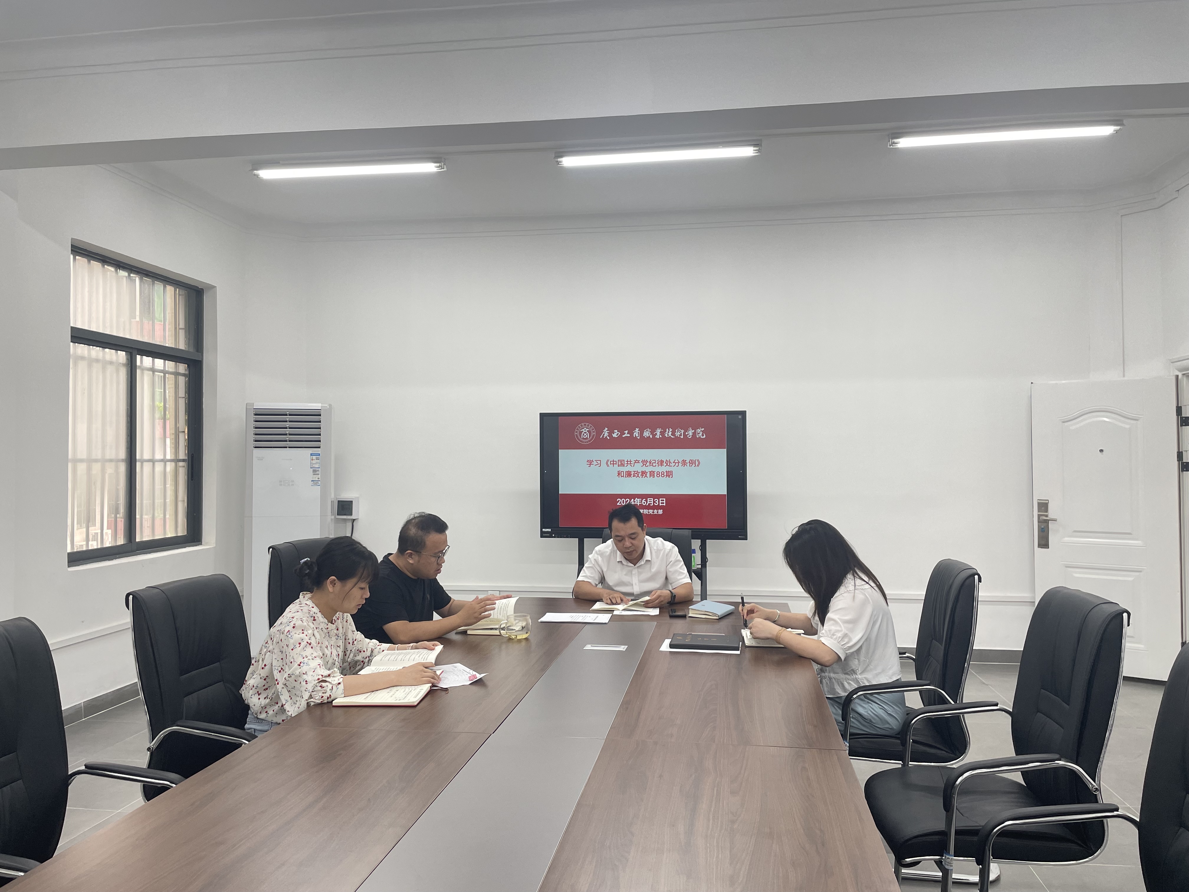 為扎實推進黨紀學習教育的落實,進一步強化黨員干部紀律意識,切實做到學紀、知紀、明紀、守紀,按照學校黨委關于開展黨紀學習教育的具體要求,6月3日上午,繼續教育學院黨支部開展《中國共產黨紀律處分條例》和廉政教育第88期學習專題會,會議由支部書記李朝鋒同志主持。